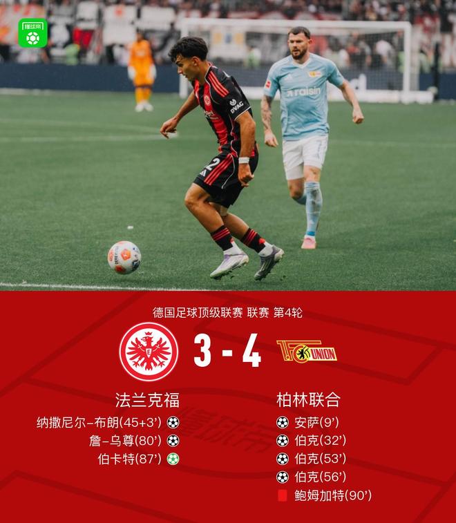 北京时间9月21日21:30德甲第4轮,法兰克福主场对阵柏林联合。上半场,安萨、伯克破门,布朗扳回一球;下半场,伯克三分钟连进两球完成戴帽,随后詹-乌尊、伯卡特帮助法兰克福迫近比分。